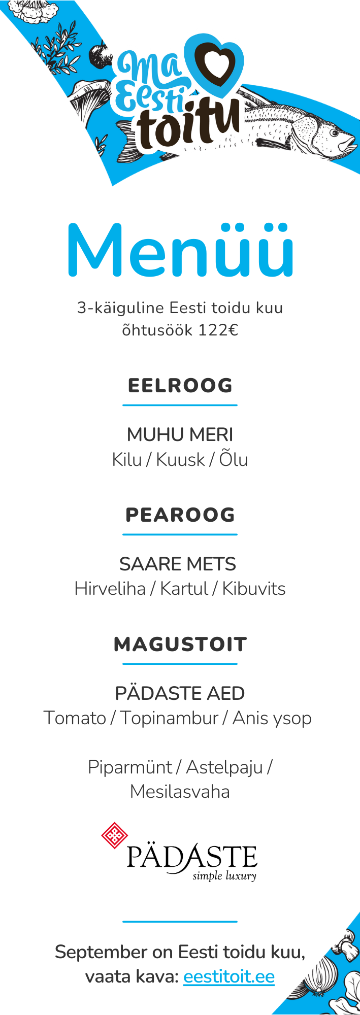 ◾ Peakokk: Achim Braitsch ◾ Asukoht: Pädaste mõis, Muhu saar, 94716 Saaremaa ◾ Kontakt: info@padaste.ee, telefon 372 45 48 800 |