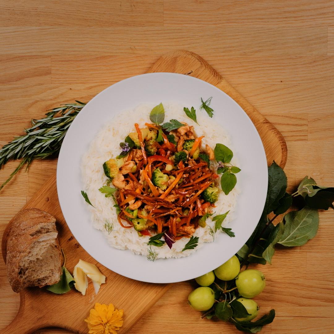 Seejärel nirista peale sojakaste. Sega kõik läbi ja kuumuta veel paar minutit. Tõsta taldrikule riis ja köögivilja-kana segu. Kaunista krõbedate seesamiseemnetega.