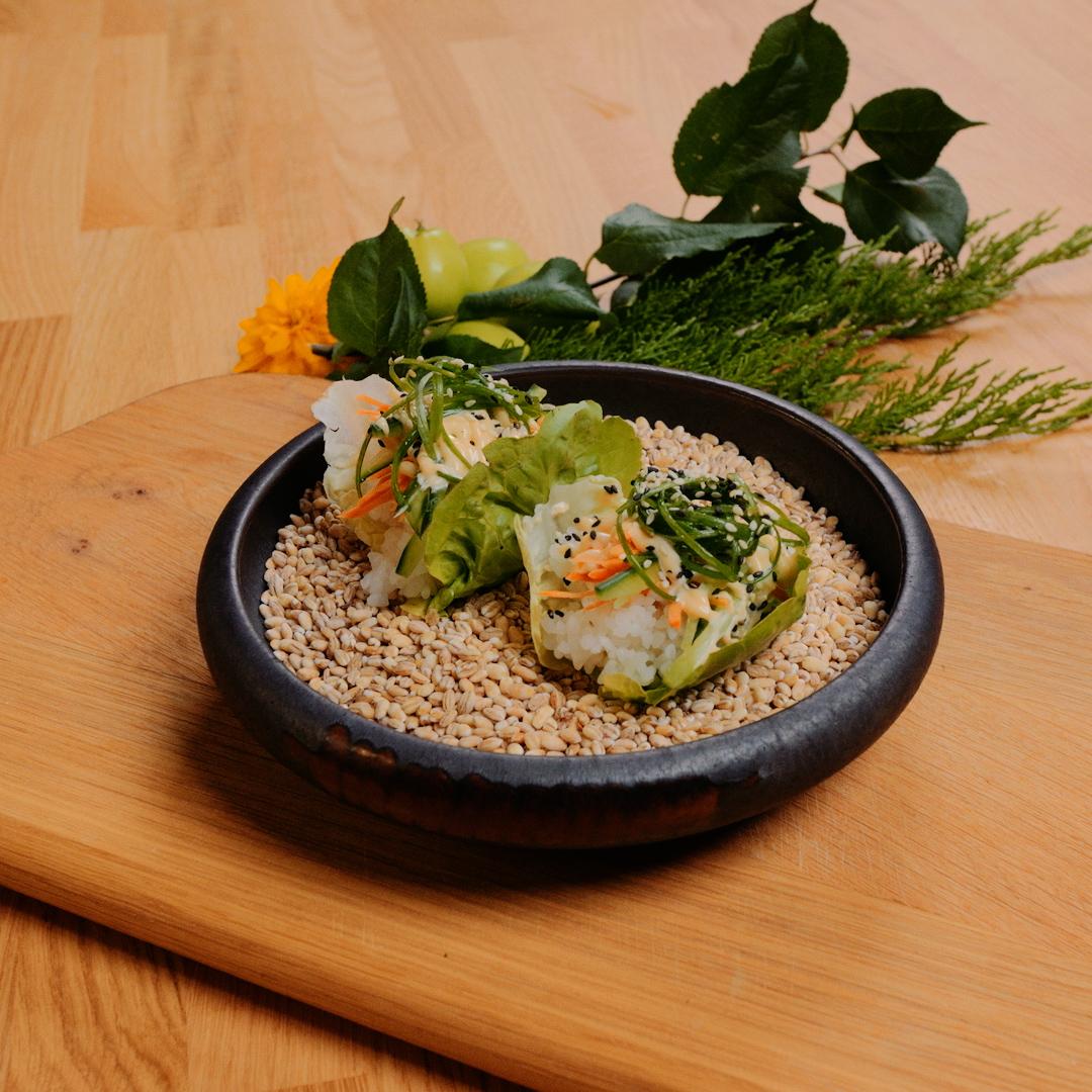Eralda suuremad, täitmiseks mõeldud mini rooma salati lehed ja tõsta kõrvale. Ülejäänud rooma salat haki ribadeks. Lõika kurk, porgand ja avokaado ribadeks ehk julienneiks. Tõsta maitsestatud riis rooma salati lehe peale, seejärel tõsta sinna värvilised köögiviljad. Kõige peale nirista majoneesi ja kaunista rohelise sibula ning mustade seesamiseemnetega.